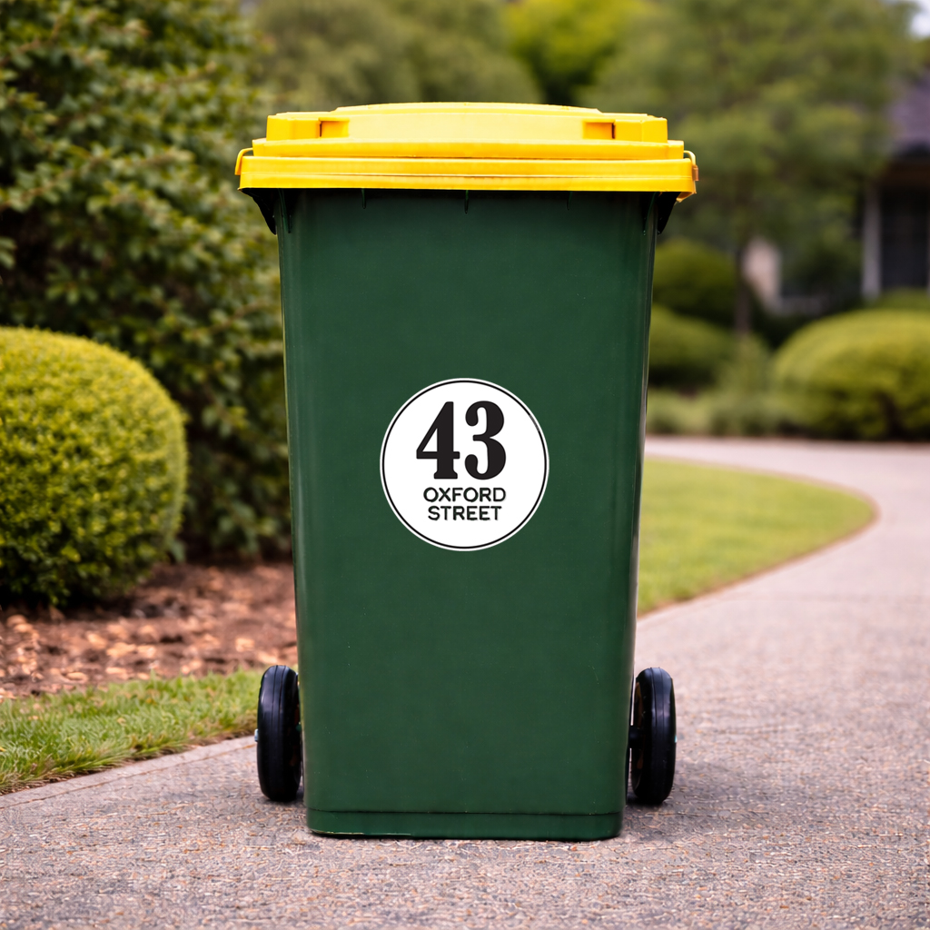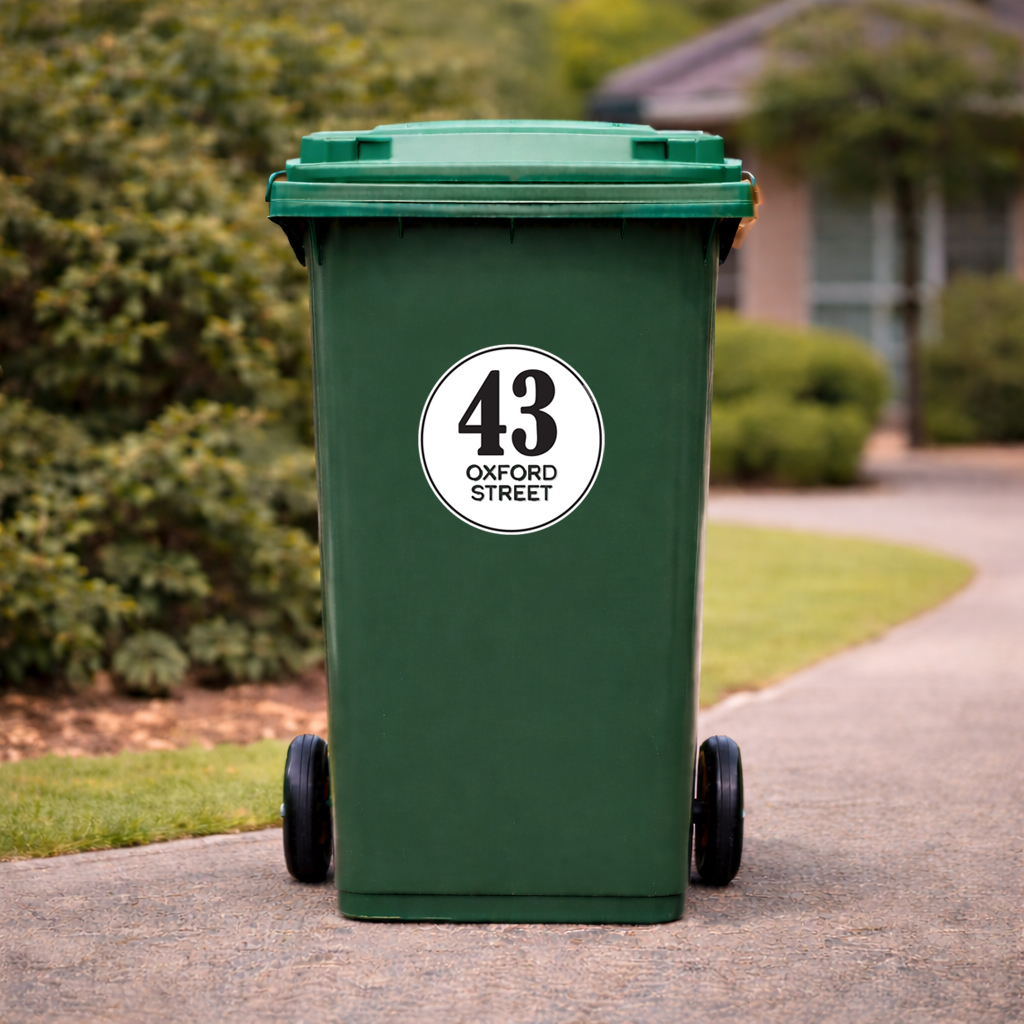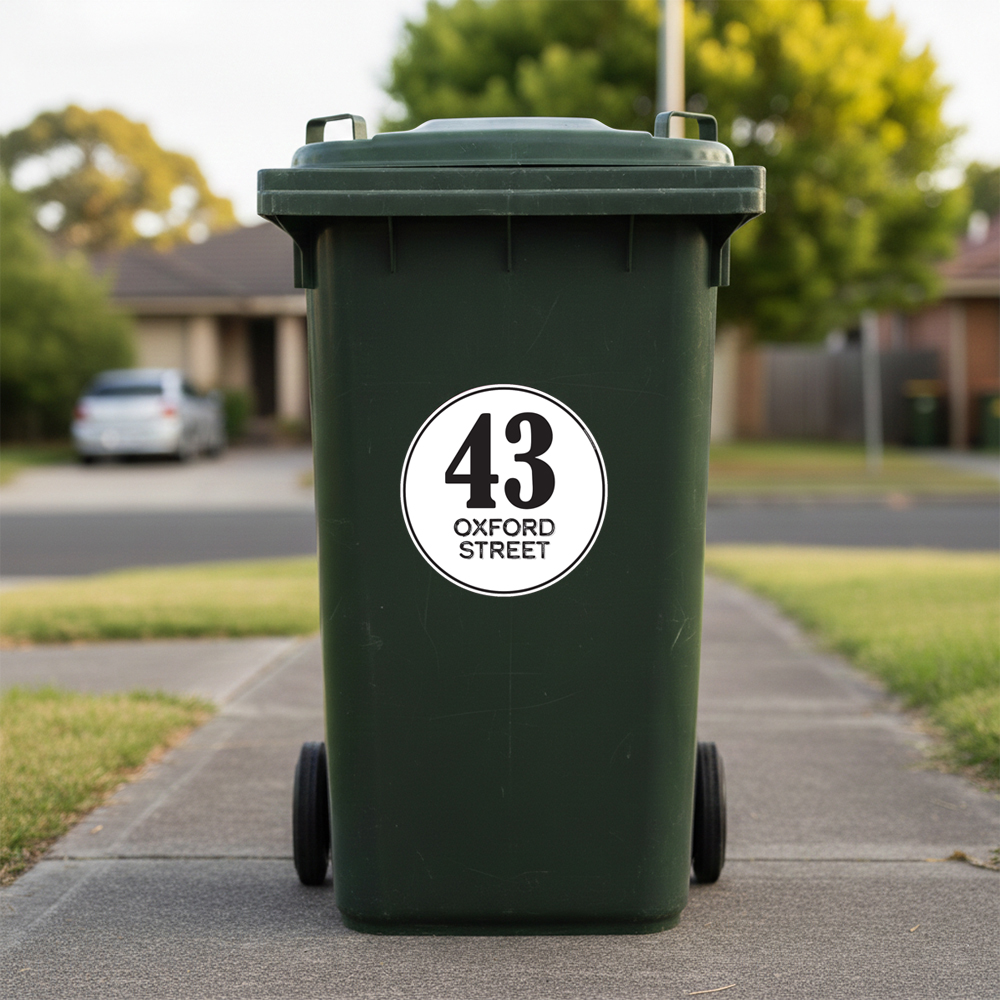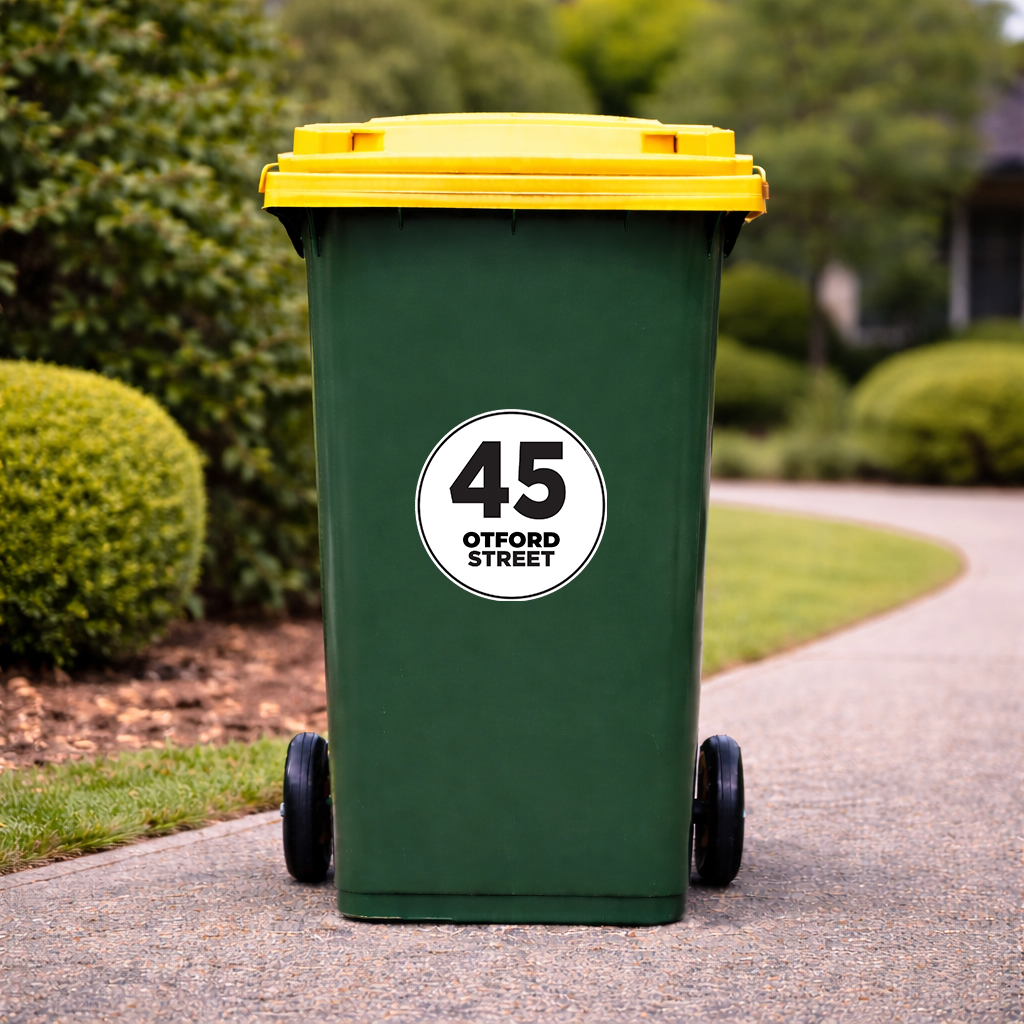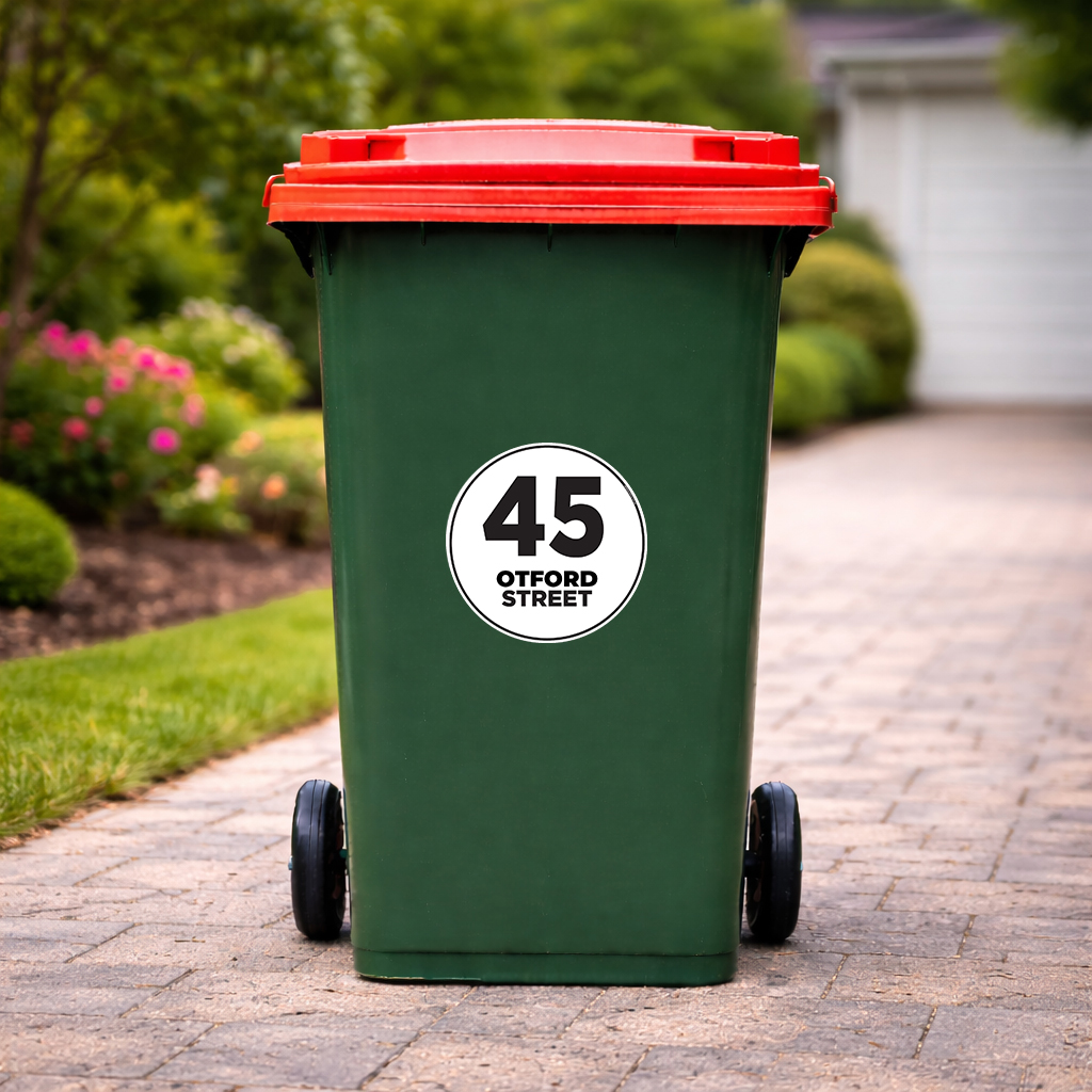 Our 230 mm round wheelie bin stickers feature large, bold house numbers with the street name displayed neatly underneath, making your bin instantly recognisable from the kerb.