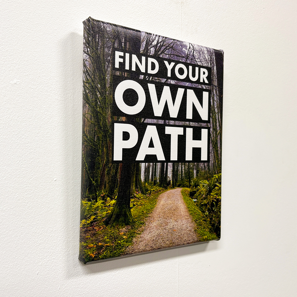 This inspirational canvas print features the message “Find Your Own Path”, paired with a natural landscape photograph taken in Vancouver, British Columbia, Canada by our in-house photography team. The image captures a peaceful walking trail framed by native surroundings, reinforcing the message of direction, independence, and personal journey.